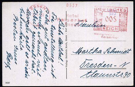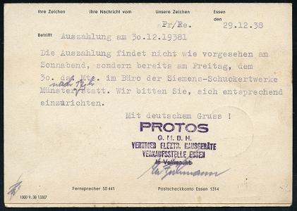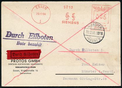7394 | 28 € | 4300 Essen Absender-Freistempel : ESSEN/ 1/ SIEMENS.. 1938 (29.12.) AFS Francotyp "Reichsadler" 046 Pf. (Firmen-Monogramme) auf Firmen-Eil-Kt.: PROTOS GMBH, (VERTRIEB ELEKTRISCHER HAUSGERÄTE).. n. Münster, vs. AS., seltene Portostufe! (Dü.E-5BAh) | ![]() ![]() | |