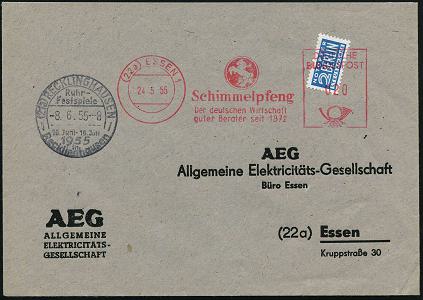 7420 | 18 € | 4300 Essen Absender-Freistempel : (22a) ESSEN 1/ Schimmelpfeng/ d.deutschen Wirtschaft/ guter Berater seit 1872 1955 (24.5.) AFS Postalia "Posthorn" auf 2 Pf. NoB = Vorausentwertung, vorausfrankierter Antwort-Bf. an die AEG , vorschriftsmäßiger Aufgabe-Stpl.: (21 a) RECKLINGHAUSEN/ Ruhr-Festspiel.. vom 8.6., seltene Verwendung! (Dü.E-23 B) | ![]() | |