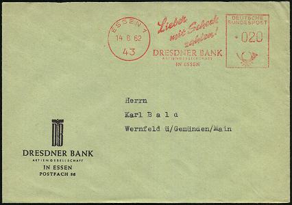 7427 | 18 € | 4300 Essen Absender-Freistempel : 43 ESSEN 1/ Lieber/ mit Scheck/ zahlen!/ DRESDNER BANK 1962 (14.8.) AFS Francotyp, Sondertype Orts-1K mit kleiner PLZ! , klar gest. Firmen-Bf., vergl. Kat.-Nr.7428 (Dü.E-23DO, Sondertype, nur kurze Verwendungszeit) | ![]() | |