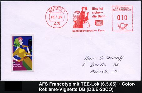 7433 | 16 € | 4300 Essen Absender-Freistempel : 43 ESSEN 1/ Eins ist/ sicher-/ die Bahn/ DB/ Bundesbahndirektion Essen 1965 (6.5.) AFS Francotpy (TEE-Diesellok, Reisende) + DB-Reklame-Vignette, Fern-Bf. n. West-Berlin (Dü.E-23CO) | ![]() | |
