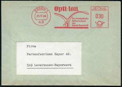 7435 | 12 € | 4300 Essen Absender-Freistempel : 43 ESSEN 1/ Opti-lon/ Der meistverkaufte/ reißverschluß.. 1966 (25.11.) AFS Francotyp (Reißverschluß) klar gest. Fern-Bf., schönes Motiv! (Dü.E-23CO) | ![]() | |
