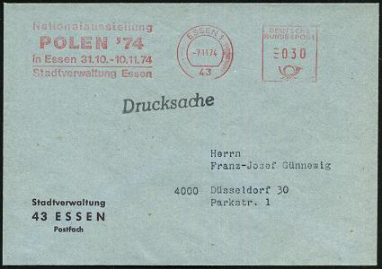 7439 | 14 € | 4300 Essen Absender-Freistempel : 43 ESSEN 1/ Nationalausstellung/ POLEN´74/ ..31.10.-10.11.74/ Stadtverwaltung 1974 (7.11.) seltener AFS Pitney-Bowes auf Dienst-Bf.: Stadtverwaltung.. (Dü.E-26E, nur kurze Verwenndungszeit) | ![]() | |
