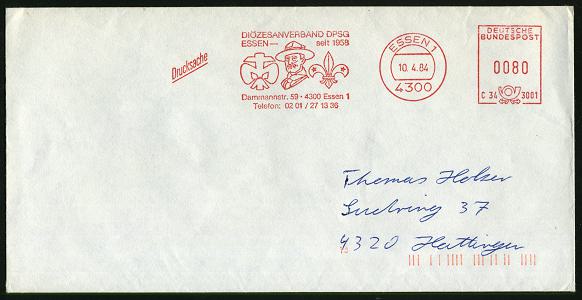 7442 | 12 € | 4300 Essen Absender-Freistempel : 4300 ESSEN 1/ C34 3001/ DIÖZESANVERBAND DPSG/ ..seit 1958 1984 (10.4.) AFS Francotyp mit Kennung = Baden-Powell (u. Scout-Lilien) klar gest., codierter Inl.-Bf. (Dü.E-26) | ![]() | |