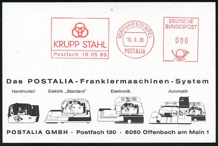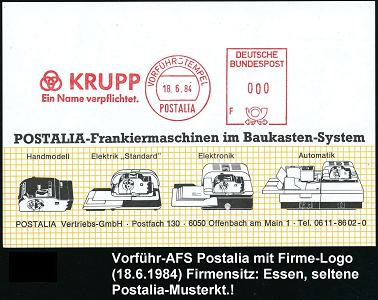 7440 | 18 € | 4300 Essen Absender-Freistempel : Essen 1 1980 (16.9.) AFS.: VORFÜHRSTEMPEL POSTALIA/KRUPP STAHL.. (Krupp-Logo) seltene Postalia-Muster-Kt. (= Specimen) | ![]() | |