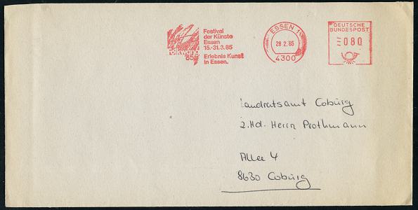 7444 | 12 € | 4300 Essen Absender-Freistempel : 4300 ESSEN 1/ Folkwang/ ´85/ Festival/ der Künste/ ..15.-31.3.85/ Erlebnis Kunst.. 1985 (28.2.) seltener AFS Pitney-Bowes , klar gest. Kommunal-Bf., nur kurze Verwendungszeit! (Dü.E-26E, nur kurze Verwendungszeit) | ![]() ![]() | |