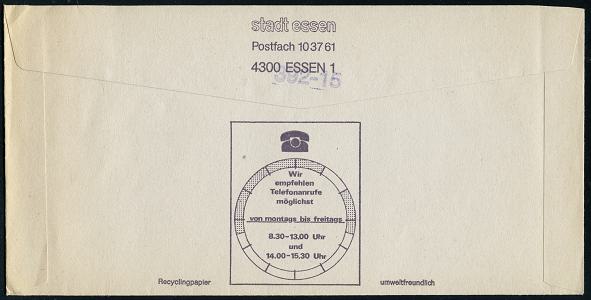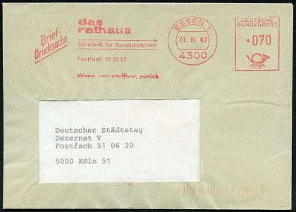7441 | 8 € | 4300 Essen Absender-Freistempel : 4300 ESSEN 1/ das/ rathaus/ Zeitschrift für Kommunalpolitik.. 1982 (6.10.) AFS Francotyp mit Zusatz "Brief-/Drucksache" , Fern-Bf. (Dü.E-26) | ![]() | |
