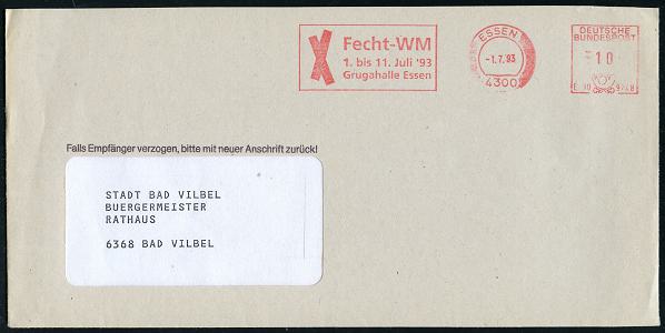 7445 | 12 € | 4300 Essen Absender-Freistempel : 4300 ESSEN 1/ E10 9748/ Fecht-WM/ 1.bis 11.Juli´93/ Grugahalle.. 1993 (1.7.) AFS Pitney-Bowes mit Kennung ("X") Kommunal-Bf., rs. Abs.-Vordruck (Dü.E-26 E, nur kurze Verwendungszeit) | ![]() | |