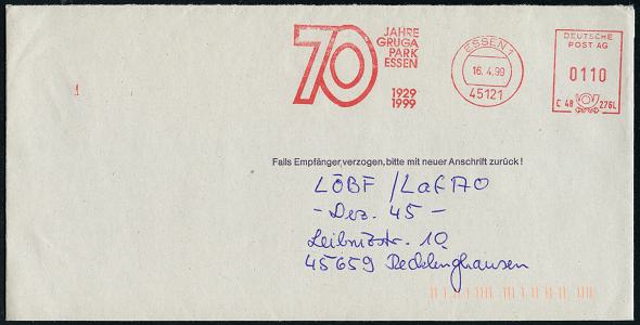 7446 | 10 € | 4300 Essen Absender-Freistempel : 45121 ESSEN 1/ C48 276L/ 70 JAHRE/ GRUGA/ PARK.. 1999 (16.4.) Jubil.-AFS Francotyp mit Kennung , Kommunal-Bf. (Dü.E-26) | ![]() | |