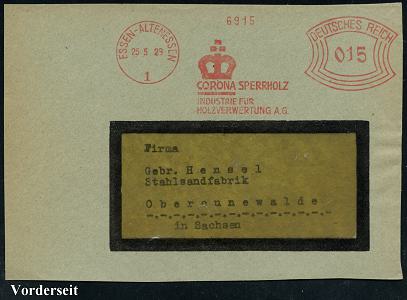 7381 | 18 € | 4300 Essen Absender-Freistempel : ESSEN-ALTENESSEN/ 1/ CORONA SPERRHOLZ/ INDUSTRIE FÜR/ HOLZVERARBEITUNG AG 1929 (25.5.) AFS Francotyp "Bogenrechteck" (Firmen-Logo) kleine Bedarfs-Vorderseite (Dü.E-1CAh = frühe C-Maschine !) | ![]() | |