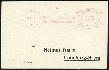 7383 | 22 € | 4300 Essen Absender-Freistempel : ESSEN/ 1/ Siedlungsverband/ Ruhrkohlebezirk 1930 (10.1.) AFS Francotyp "Bogenrechteck" klar aus Drs.-Karte (Dü.E-1CAh = frühe C-Maschine !) | ![]() | |