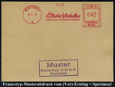 7390 | 35 € | 4300 Essen Absender-Freistempel : ESSEN/ 1/ der Ruhr Arbeiter/ Amtliches Organ der Deutschen Arbeitsfront 1934 (23.5.) AFS-Musterabdruck Francotyp "Hakenkreuz" (Hand mit Zahnrad) glasklar gest. Francoty-Musterblatt vom (Vor)-Ersttag !, selten! (Dü.E-3CEh) | ![]() ![]() | |