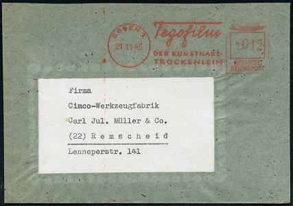 7398 | 35 € | 4300 Essen Absender-Freistempel : ESSEN 1/ Tegofilm/ DER KUNSTHARZ-/ TROCKENLEIM 1945 (21.11.) aptierter AFS Francotyp "Reichsadler" ANTIQUE, große Reste des Reichsadlers= entfernt = unbekannte Type = Notmaßnahme! , klar gest. Fern-Bf. (Dü.E-14 B-211 ähnlich = unbekannte Type!) | ![]() | |