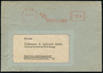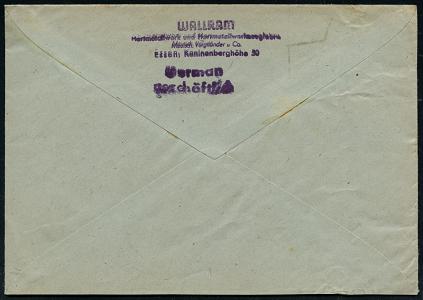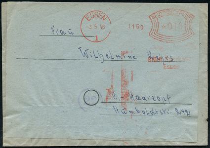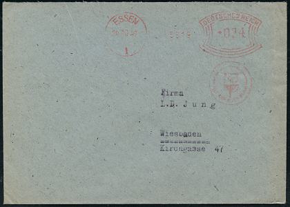 7406 | 25 € | 4300 Essen Absender-Freistempel : ESSEN/ 1/ WALLRAM 1946 (17.10.) aptierter AFS Francotyp "Reichsadler" = entfernt + Inschrift = Notmaßnahme! (Firmen-Logo) rs. Abs. 4L: ...Meutsch, Voigtländer & Co (Dü.E-13 AT-127o) | ![]() ![]() | |