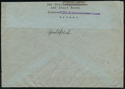 7403 | 25 € | 4300 Essen Absender-Freistempel : ESSEN/ 1/ Städt.Sparkasse.. 1946 (3.5.) AFS Francotyp "Bogenrechteck" unverändert weiterverwendet = Notmaßnahme! , Recycling-Orts-Bf. (doppelt verwendet) rs. Abs.: ..Stadt Essen, Stadtamt + viol. 1L: Städt. Krankenanstalten.. (Dü.E-1Am, unverändert weiterverwendet) | ![]() ![]() | |