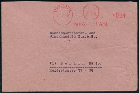 7405 | 25 € | 4300 Essen Absender-Freistempel : ESSEN 1/ Ferrostahl AG 1946 (19.7.) total aptierter AFS Francotyp = Wertrahmen total entfernt = Notmaßnahme! , rs. Abs.-Vordruck, Fern-Bf. n. Ost-Berlin! (Dü.E-16-244o) | ![]() ![]() | |