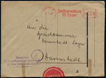 7408 | 30 € | 4300 Essen Absender-Freistempel : ESSEN 1/ Stadtverwaltung/ (22a) Essen 1947 (11.4.) aptierter AFS Francotyp "Reichsadler" = entfernt + Inschrift = Notmaßnahme! + viol. Abs.-4L: Deutscher Entnazifierungs-Ausschuß.., Recycling-Fern-Bf. an "Spruchkammer Darmstadt Lager.." = Lager für NS-Belastete + rote Siegel-Oblate: Stadt Essen, seltener Beleg! (Dü.E-13 AT-147o) | ![]() | |