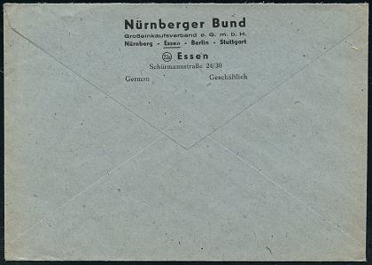 7412 | 25 € | 4300 Essen Absender-Freistempel : ESSEN/ 1/ NÜRNBERGER BUND 1947 (24.10.) AFS Francotyp "Bogenrechteck" mit Inschrift "DEUTSCHES REICH" unverändert weiterverwendet = Notmaßnahme! (Logo: Trichter) rs. Abs.-Vordruck: Nürnberger Bund, Großeinkaufsverband.., Fern-Bf. (Dü.E-1Amh, unverändert weiterverwendet) | ![]() ![]() | |