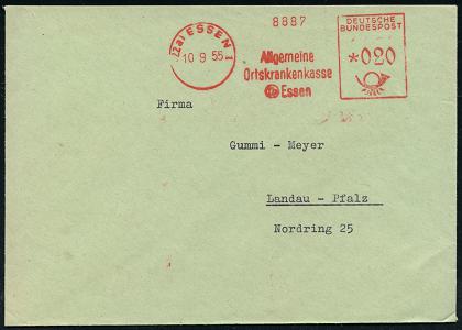 7421 | 12 € | 4300 Essen Absender-Freistempel : (22a) ESSEN 1/ Allgemeine/ Ortskrankenkasse.. 1955 (10.9.) AFS Francotyp "Posthorm" mit alter Zählnr.! , Fern-Bf. (Dü.E-23Ah = seltene Type!) | ![]() | |