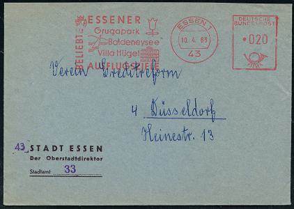 7429 | 10 € | 4300 Essen Absender-Freistempel : 43 ESSEN 1/ ESSENER/ Grugapark/ Baldeneysee/ Villa Hügel.. 1963 (10.4.) AFS Francotyp (Baldeneysee mit Segelboot, Villa Hügel = Krupp-Villa etc.) Dienst-Bf.: STADT ESSEN, Der Oberstadtdirektor (Dü.E-26) | ![]() | |