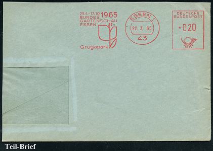 7432 | 10 € | 4300 Essen Absender-Freistempel : 43 ESSEN 1/ ..BUNDES/ GARTENSCHAU/ ESSEN/ Grugapark 1965 (22.3.) AFS (Pflanze) auf Teil-Bf. (Dü.E-26, nur kurze Verwendungszeit) | ![]() | |