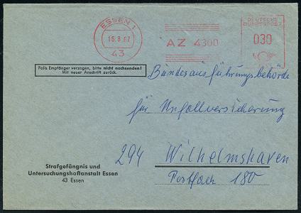 7436 | 18 € | 4300 Essen Absender-Freistempel : 43 ESSEN 1/ A Z 4300 1967 (16.8.) anonymer AFS Francotyp = Strafgefängnis , Dienst-Bf.: Strafgefängnis u. Untersuchungshaftanstalt Essen n. Wilhelmshaven (Dü.E-23CO) | ![]() | |
