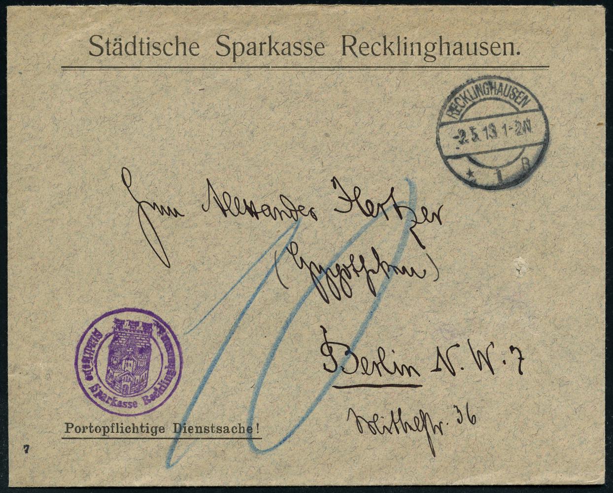 7496 | 18 € | PL-Raum 43.. (ohne Essen u. Mülheim/Ruhr) : RECKLINGHAUSEN/ *1B 1913 (2.5.) 1K-Brücke auf Dienst-Bf.: Städt. Sparkasse.. Portopflichtige Dienstsach + viol. HdN: Städt Sparkasse Recklinghausen (Wappen) unfrankierter Fern-Nachporto-Bf. ("10" Pf. Nachporto) | ![]() | |