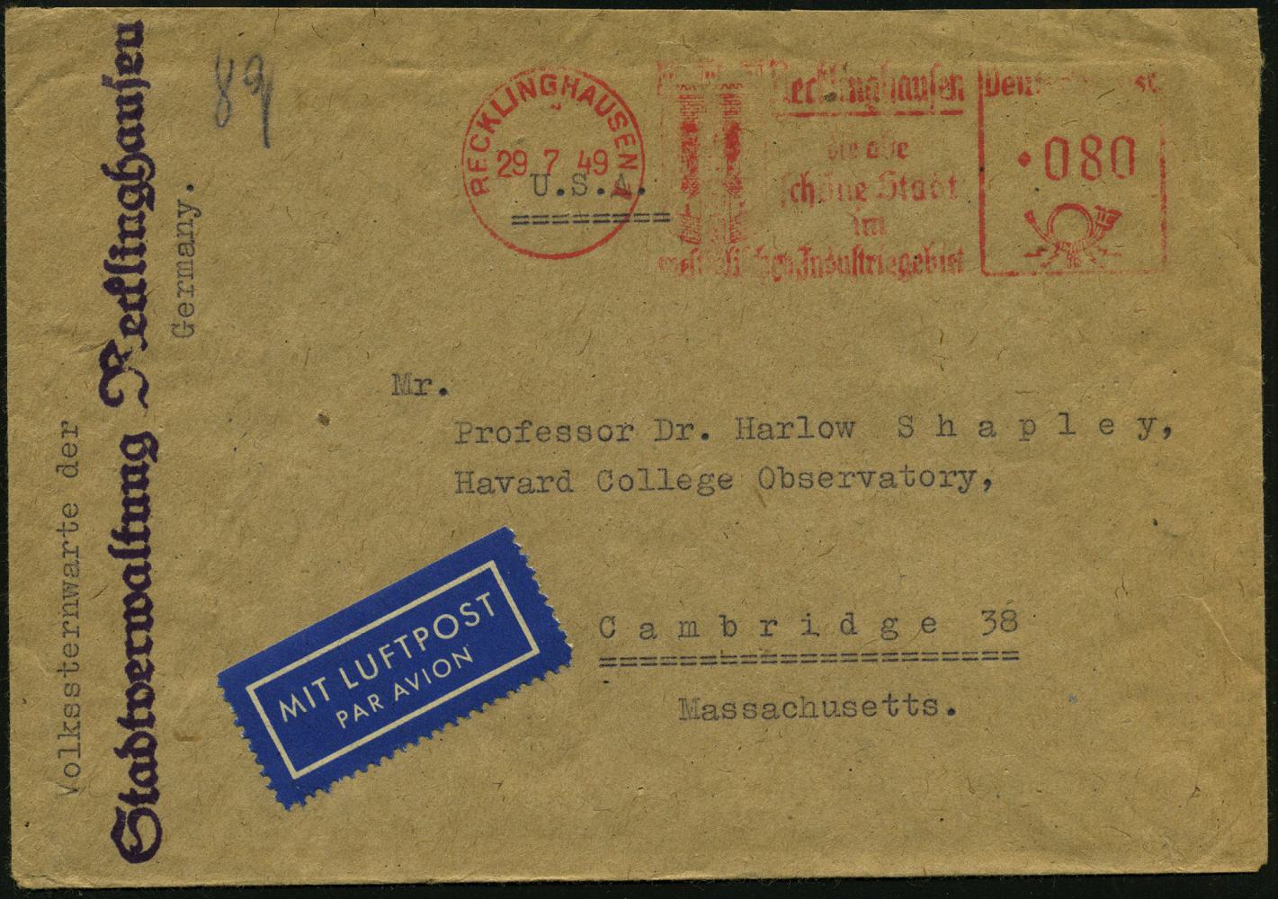 7498 | 18 € | PL-Raum 43.. (ohne Essen u. Mülheim/Ruhr) : RECKLINGHAUSEN 1/ die alte/ schöne Stadt.. 1949 (29.7.) AFS Francotyp "Posthorn" 080 Pf. + viol. 1L: Stadtverwaltung.., Übersee-Flp.-Dienst-Bf. n.USA (Götz + 60.- DM, 1980) = 1. Gew.-Stufe (Dü.E-20DG) | ![]() | |