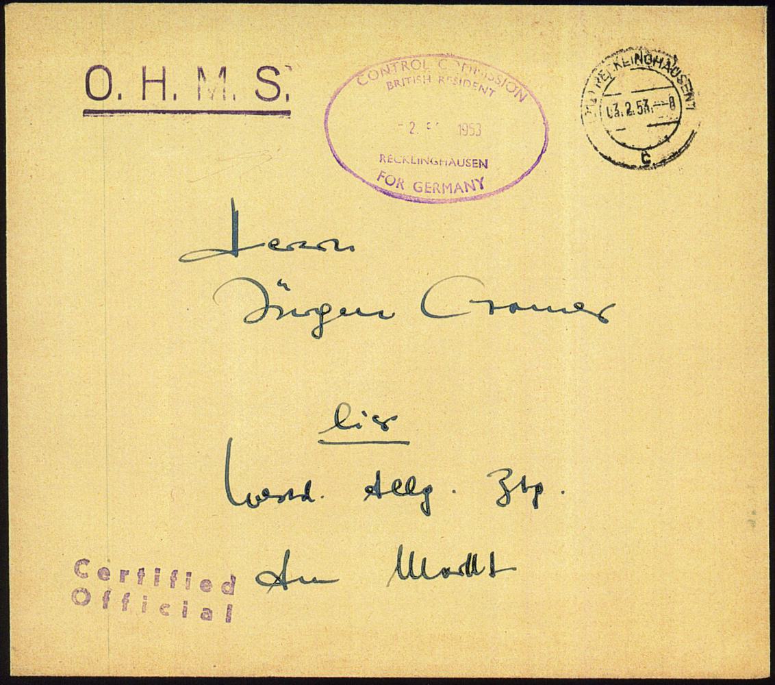 7499 | 20 € | PL-Raum 43.. (ohne Essen u. Mülheim/Ruhr) : (21a) RECKLINGHAUSEN 1/ c 1953 (3.2.) 2K-Steg + viol. Oval-HdN: CONTROL COMMISSION/ BRITISH RESIDENT/ RECKLINGHAUSEN/ FOR GERMANY + 1L: O. H. M. S. + 2L: Certified/Official, portofreier Orts-Dienstbf. | ![]() | |