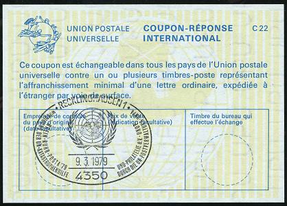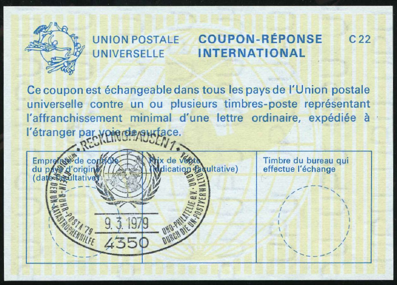 7504 | 14 € | PL-Raum 43.. (ohne Essen u. Mülheim/Ruhr) : 4350 RECKLINGHAUSEN 1/ ..UN-KATASTROPEHNHILFE/ ..UNOP 1979 (9.3.) SSt = UNO-Logo auf Internat. Antwortschein, Typ Lausanne, seltene Verwendung! | ![]() | |