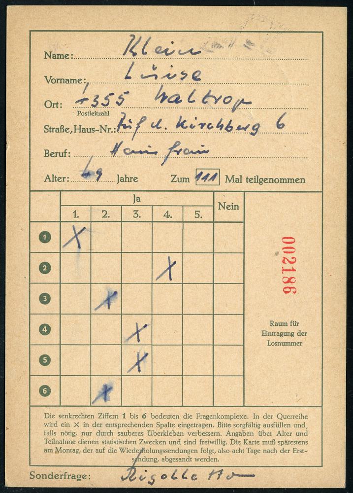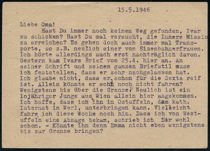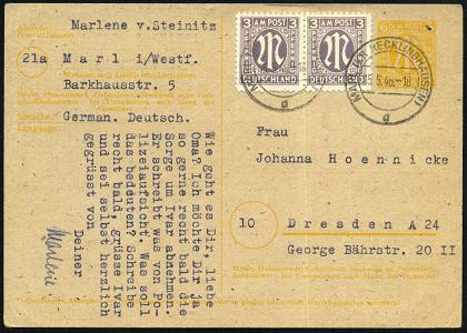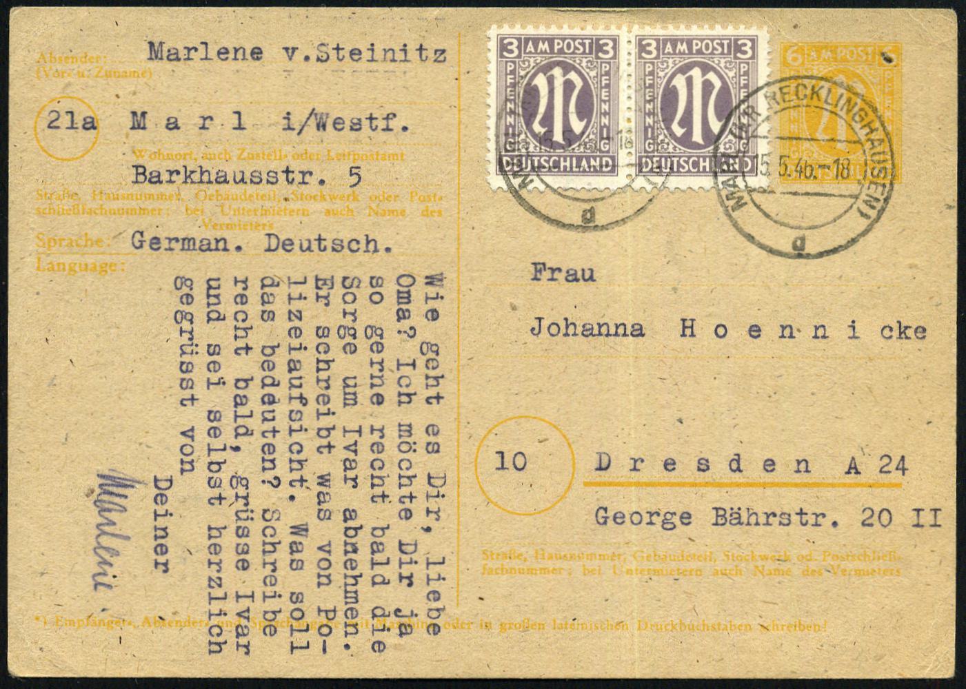 7488 | 15 € | PL-Raum 43.. (ohne Essen u. Mülheim/Ruhr) : MARL (KR RECKLINGHAUSEN)/ d 1946 (15.5.) amtl. P 6 Pf. AM-Post gelb + Zusatzfrankatur 2x 3 Pf. AM-Post viol. , Bedarfs-Fern-Kt. in die SBZ, Text über Schulprobleme (Mi.P 905) | ![]() ![]() | |