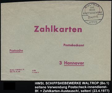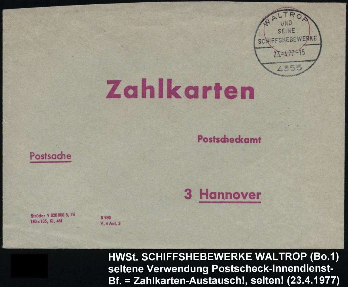 7510 | 15 € | PL-Raum 43.. (ohne Essen u. Mülheim/Ruhr) : 4355 WALTROP/ UND/ SEINE/ SCHIFFSHEBEWERKE 1977 (23.4.) HWSt klar auf PSch-Innendienst-Bf.: Zahlkarten.. (braun/grün) für Zahlkarten-Austausch!, seltene Verwendung! (Bo.1) | ![]() | |