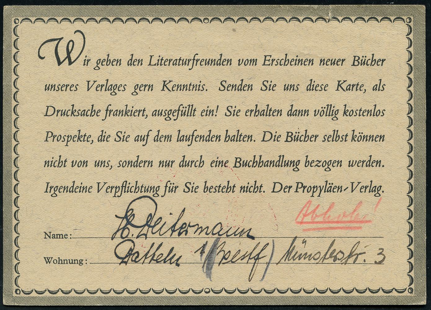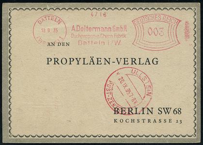 7451 | 30 € | PL-Raum 43.. (ohne Essen u. Mülheim/Ruhr) : DATTELN/ (WESTF) 1/ A.Deitermann GmbH/ Dachpappen u. chem.Fabrik.. 1935 (18.9.) AFS Francotyp "Bogenrechteck" auf Antwort-Kt.: PROPYLÄEN-VERLAG = Ullstein, jüdischer Verlag von den Nazis enteignet durch NS-Tarnfirma "Cautio", später DEUTSCHER VERLAG, roter Hauspostamts-AS: ULLSTEIN/ POSTZENTRALE, Zeitdokument! (Dü.E-1CEh) | ![]() ![]() | |