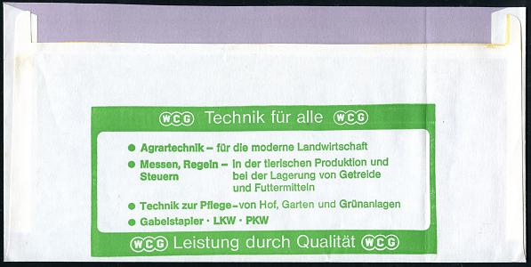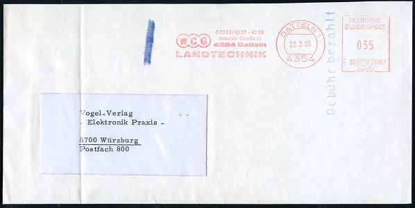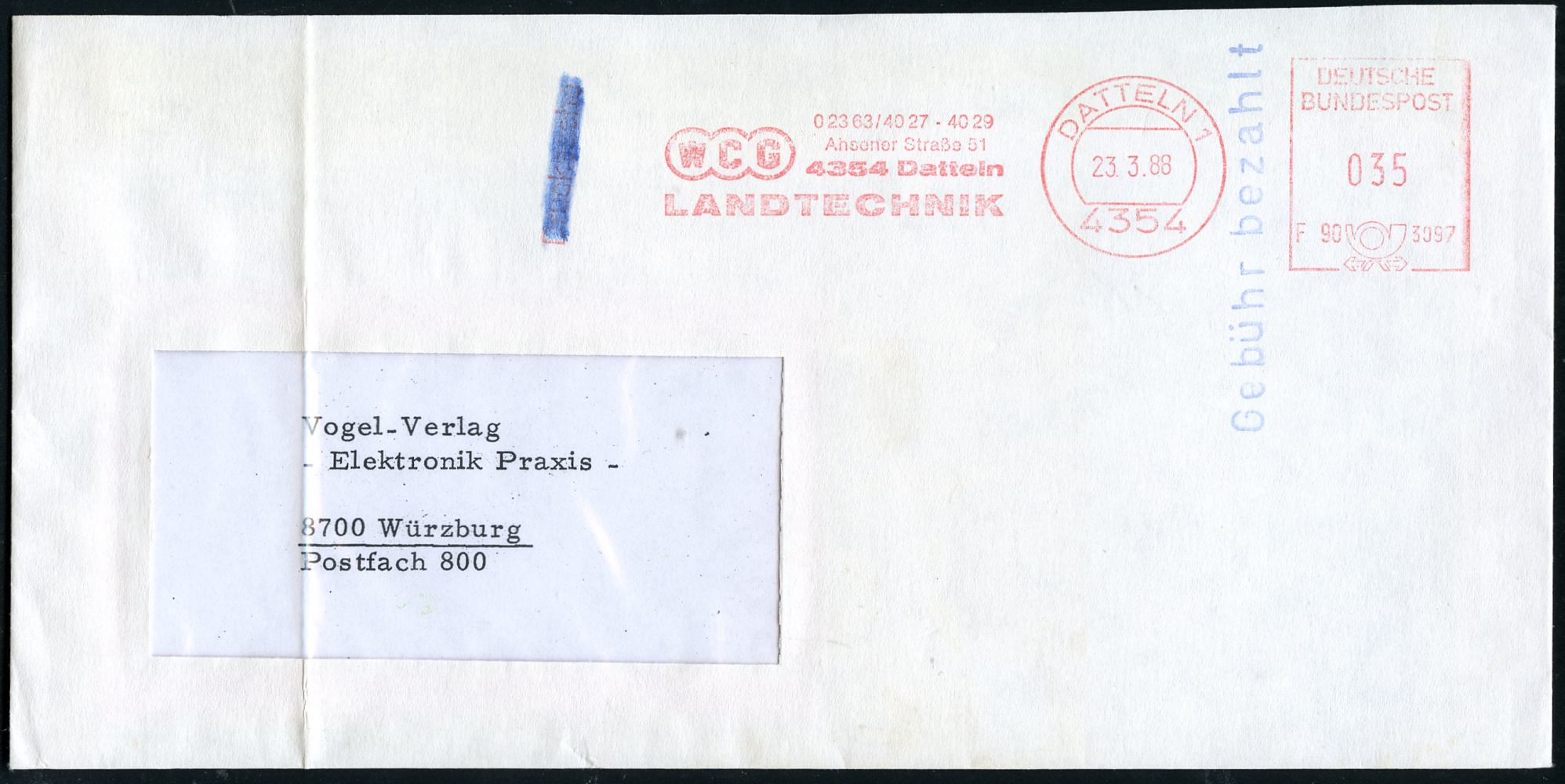 7457 | 10 € | PL-Raum 43.. (ohne Essen u. Mülheim/Ruhr) : 4354 DATTELN 1/ WCG/ ..LANDTECHNIK 1988 (23.3.) AFS Postalia mit Kennung 035 Pf. + zugestempelt: Gebühr bezahlt = Massen-Drs.! (Freistempelzusatz "Drucksache" gestrichen!) rs. Reklametext (Bf. links gefaltet) Inl.-Bf. (Dü.E-26 B) | ![]() ![]() | |