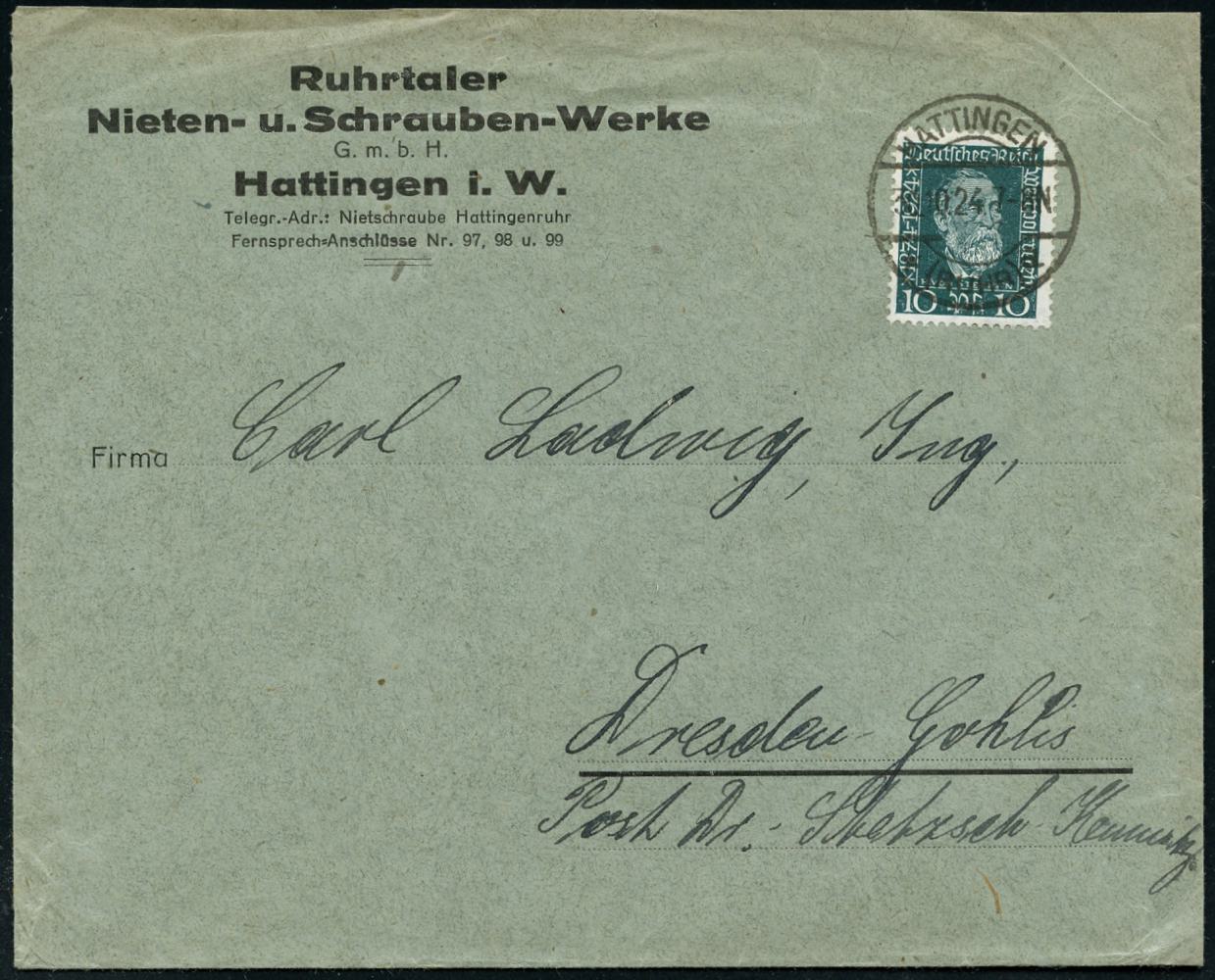 7475 | 18 € | PL-Raum 43.. (ohne Essen u. Mülheim/Ruhr) : HATTINGEN/ *(Ruhr) a 1924 (30.10.) 1K-Brücke auf EF 10 Pf. Heinr. v. Stephan , klar gest. Firmen-Bf.: Ruhrtaler Nieten- u. Schrauben-Werke GmbH.. (Mi.368 EF) | ![]() | |