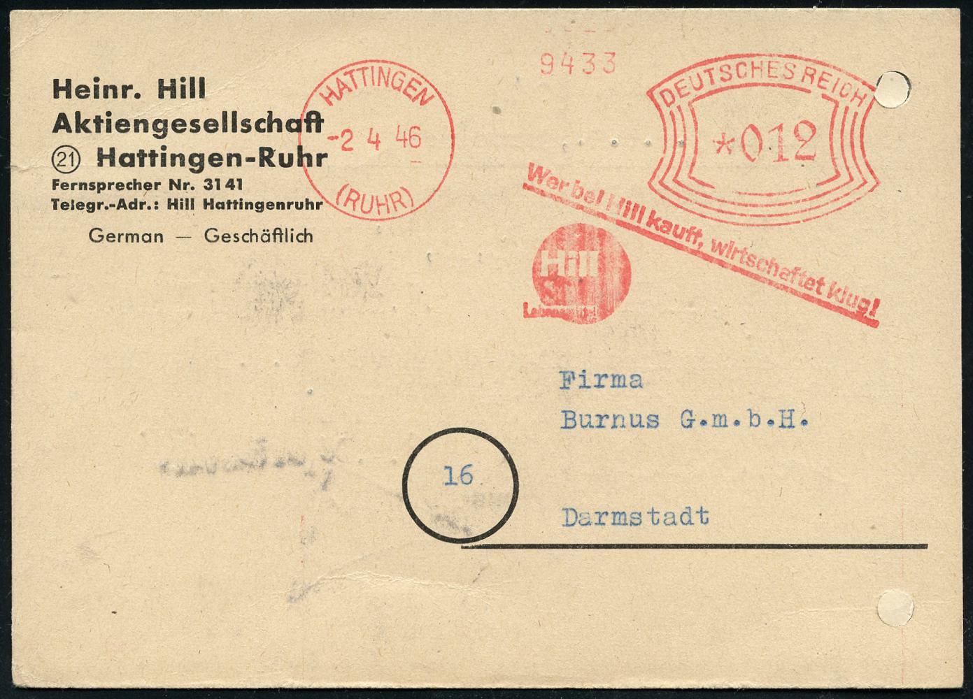 7476 | 18 € | PL-Raum 43.. (ohne Essen u. Mülheim/Ruhr) : HATTINGEN/ (RUHR)/ Wer bei Hill,wirtschaftet klug!/ Hill 1946 (2.4.) AFS Francotyp "Bogenrechteck" unverändert mit Inschrift "DEUTSCHES REICH" weiterverwendet , Firmen-Kt. (Reg.-Lochung geschl.) n. Darmstadt (Dü.E-1Ah, unverändert weiterverwendet) | ![]() | |