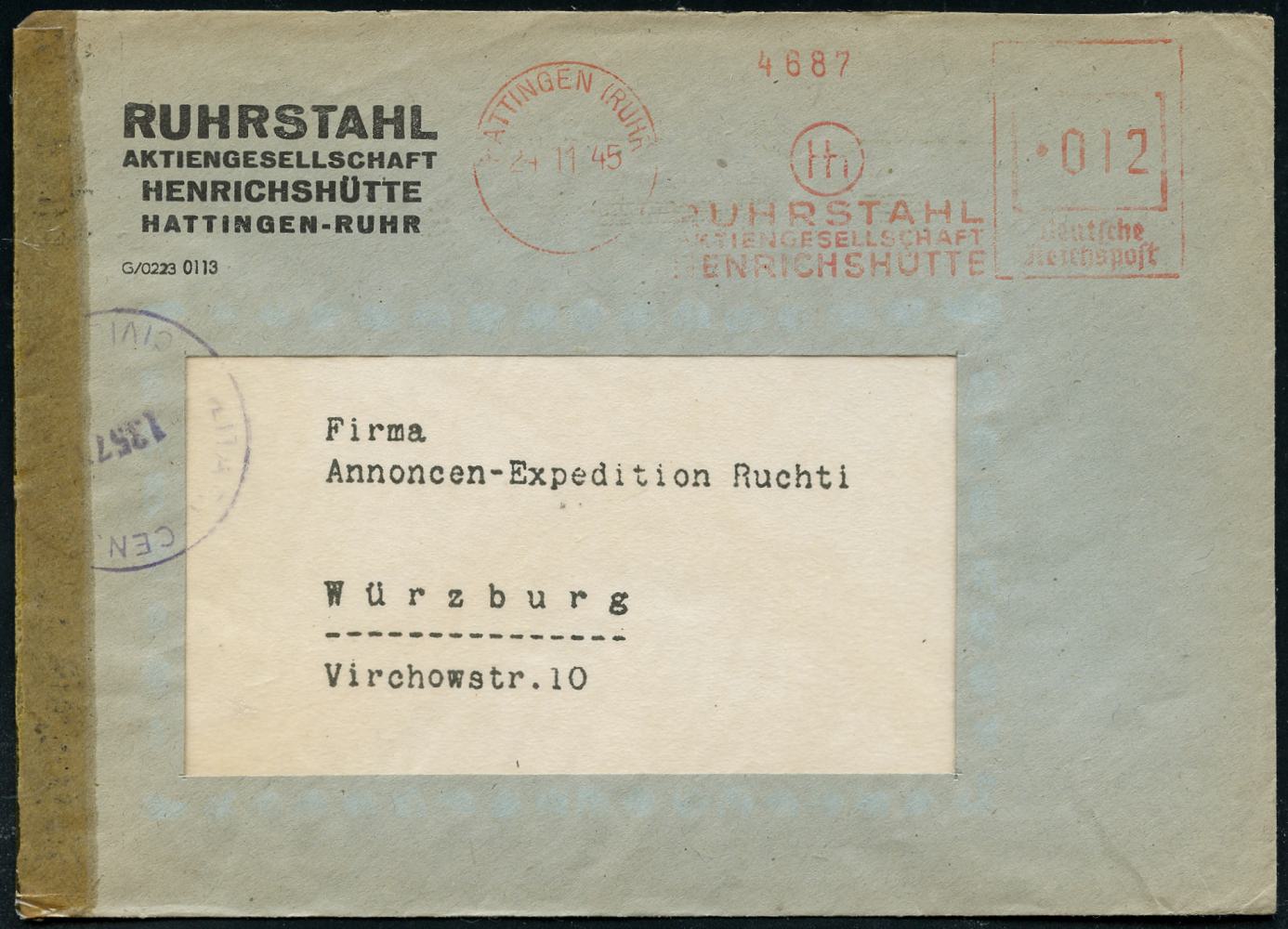7477 | 28 € | PL-Raum 43.. (ohne Essen u. Mülheim/Ruhr) : HATTINGEN (RUHR)/ RUHRSTAHL/ AG.. 1945 (24.11.) aptierter AFS Francotyp "Reichsadler" = entfernt = Notmaßnahme! (Monogr.-Logo) + 1K-Zensur: MILITARY CENSORSHIP/ 13573/CIVIL MAILS = Offenbach + neutraler Zensur-Streifen, Firmen-Zensur-Bf.: RUHRSTAHL AG, HEINRICHSHÜTTE.. (Dü.E-13 J-147h) | ![]() | |