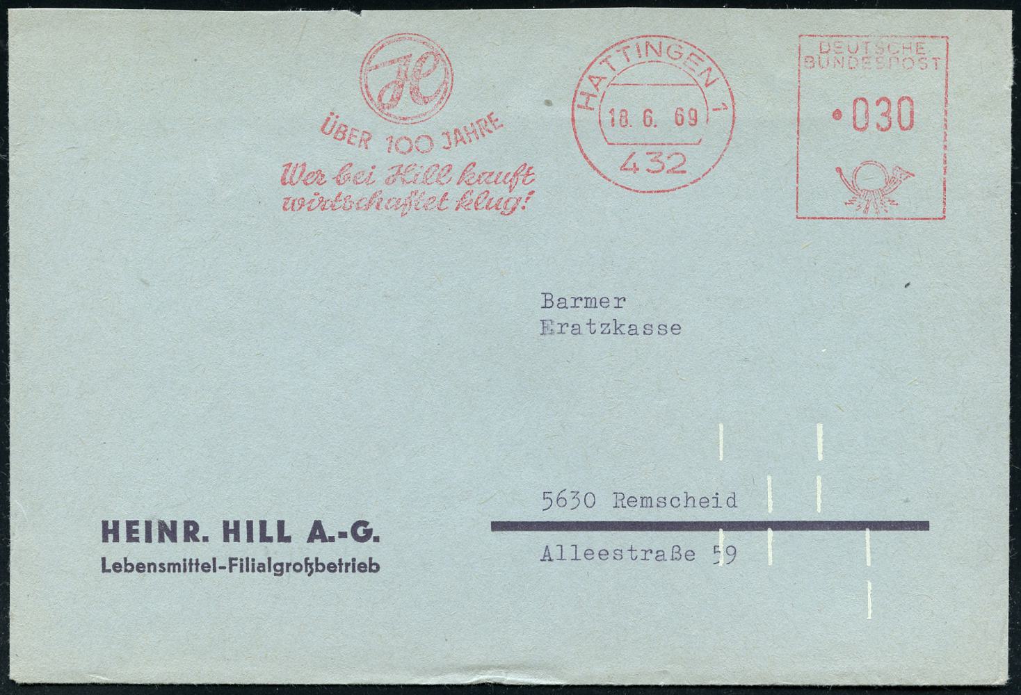 7478 | 15 € | PL-Raum 43.. (ohne Essen u. Mülheim/Ruhr) : 432 HATTINGEN 1/ H/ ÜBER 100 JAHRE/ Wer bei Hill kauft,/ wirtschaftet klug! 1969 (18.6.) AFS Francotyp auf Firmen-Bf. mit weißer Matrix-Codierung (= AEG-Telefunken-Anlage) n. Remscheid (Dü.E-26) | ![]() | |