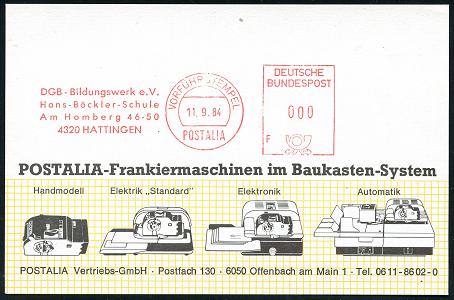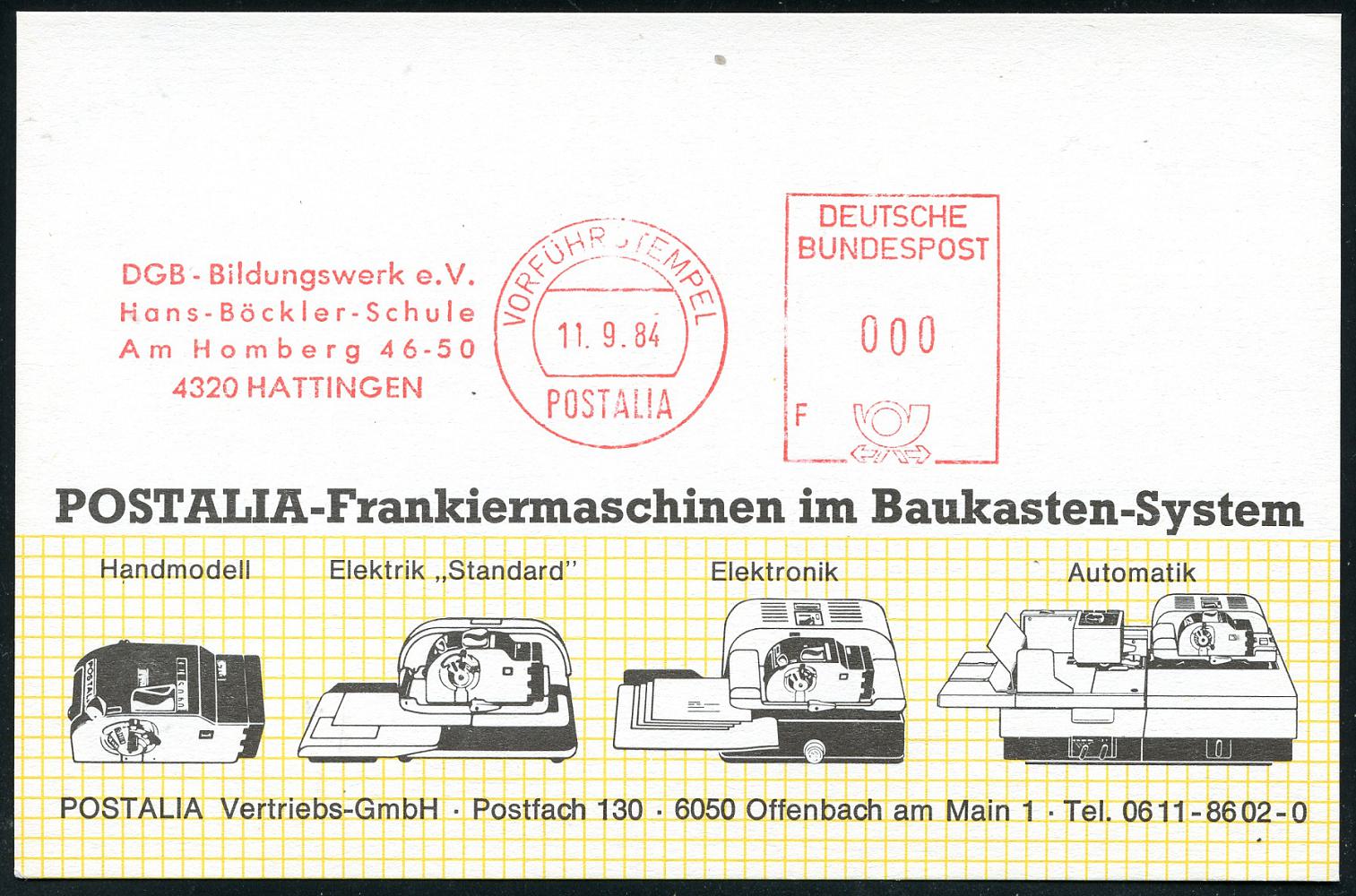 7480 | 18 € | PL-Raum 43.. (ohne Essen u. Mülheim/Ruhr) : 4320 HATTINGEN 1984 (11.9.) AFS.: VORFÜHRSTEMPEL/POSTALIA/DGB-Bildungswerk e.V./ Hans-Böckler-Schule.. , seltene Postalia-Muster-Kt. (= Specimen) | ![]() | |