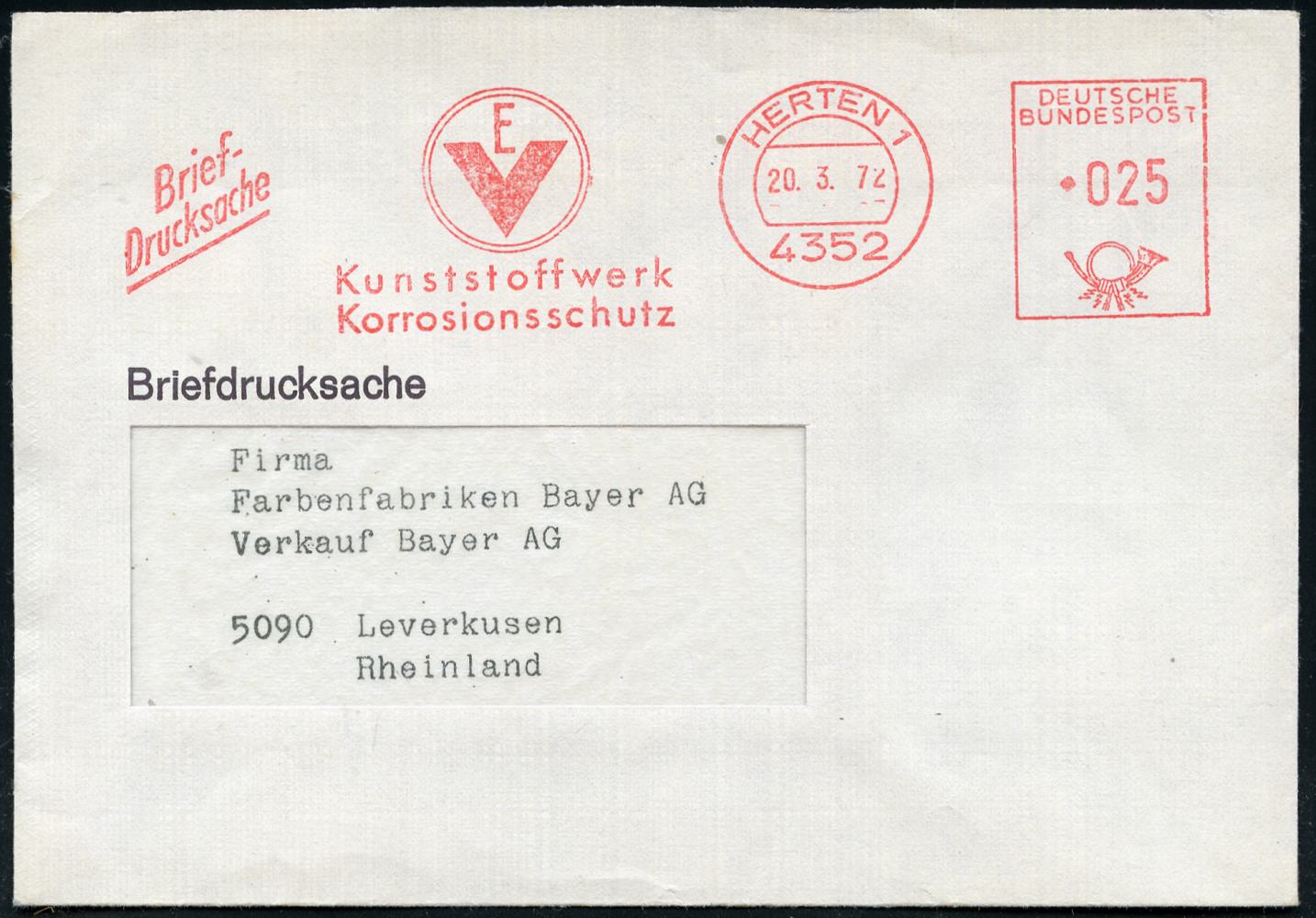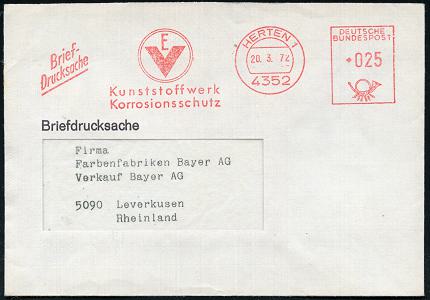 7483 | 12 € | PL-Raum 43.. (ohne Essen u. Mülheim/Ruhr) : 4352 HERTEN 1/ EV/ Kunststoffwerk/ Korrionsschutz 1972 (20.3.) AFS Francotyp (Monogr.-Logo) Inl.-Bf. (Dü.E-26) | ![]() | |