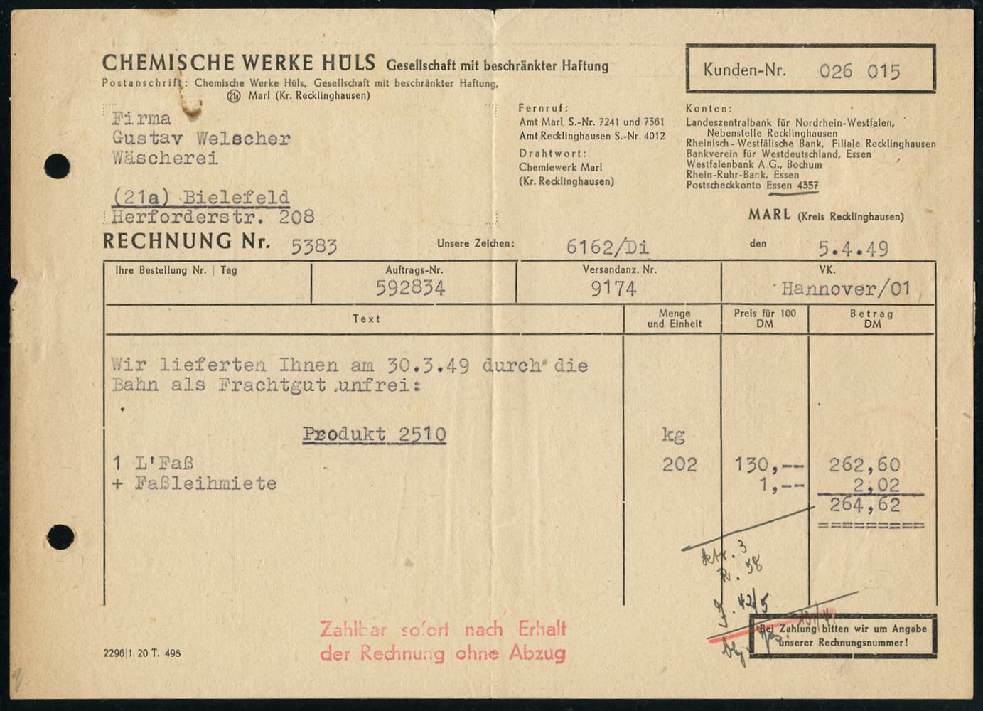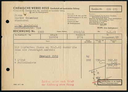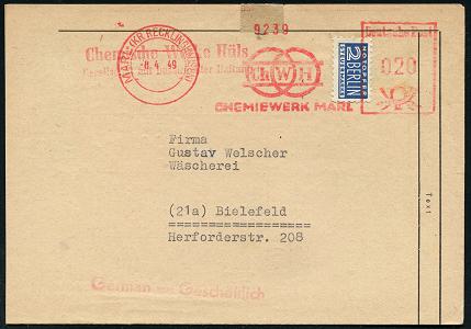 7489 | 15 € | PL-Raum 43.. (ohne Essen u. Mülheim/Ruhr) : MARL (KR RECKLINGHAUSEN)/ Ch W H/ CHEMIEWERK MARL 1949 (8.4.) AFS Francotyp "Posthorn" auf 2 Pf. NoB = Vorausentwertung (Monogr.-Logo) Firmen-Falt-Bf. mit Inhalt (innen 1x gelocht) = Rechnung n. Bielefeld (Dü.E-20CGh) | ![]() ![]() | |