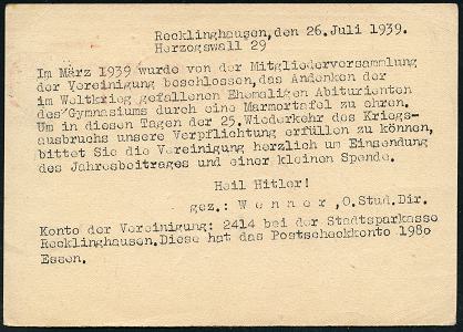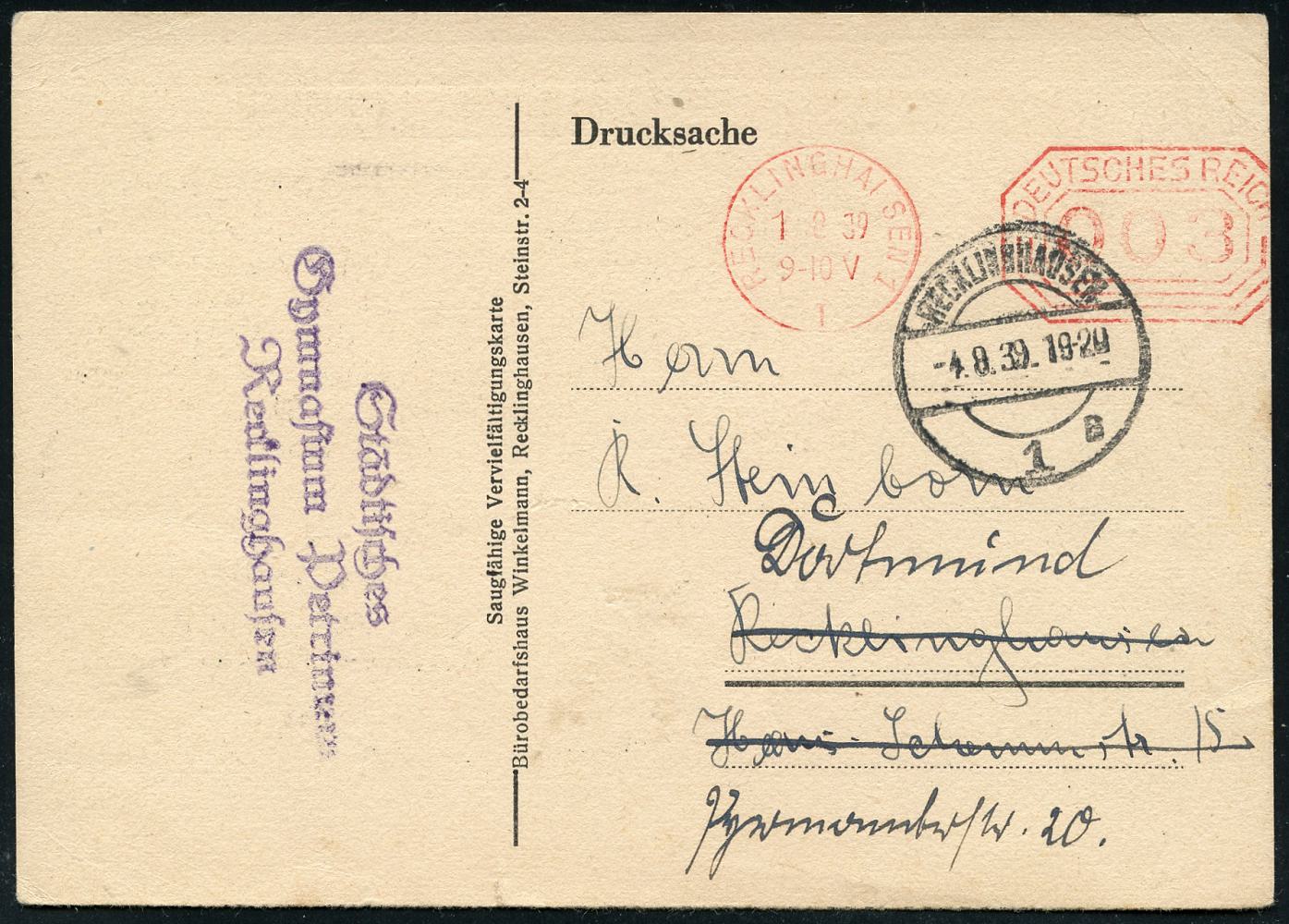 7497 | 18 € | PL-Raum 43.. (ohne Essen u. Mülheim/Ruhr) : RECKLINGHAUSEN 1/ I/ DEUTSCHES REICH 1939 (1.8./8.8.) PFS "Achteck" 003 Pf. mit vorgesetzen Nullen + 1K-Brücke: RECKLINGHAUSEN/1 a vom 4.8., da nachgesandt , Dienst-Kt.: Städtisches Gymnasium Petrinum.. (viol. Abs.-3L) n. Dortmund nachgesandt (Dü.D-4) | ![]() ![]() | |