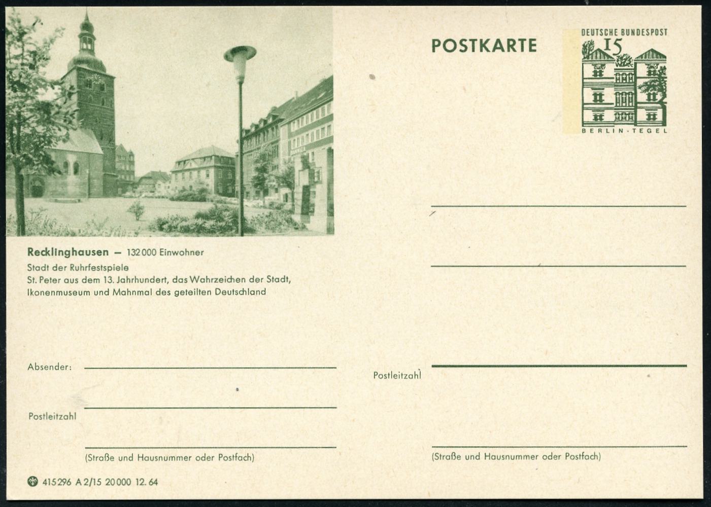 7502 | 5 € | PL-Raum 43.. (ohne Essen u. Mülheim/Ruhr) : Recklinghausen 1961 15 Pf. BiP Tegel, grün: St. Peter aus dem 13. Jahrhundert.. Ikonenmuseum.. , ungebr. | ![]() | |