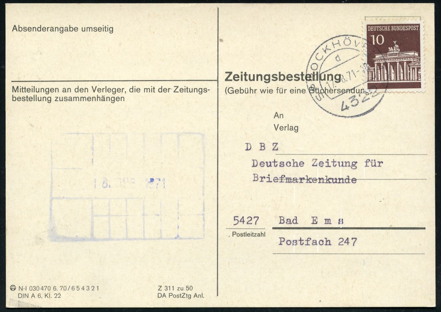 7507 | 20 € | PL-Raum 43.. (ohne Essen u. Mülheim/Ruhr) : 4322 SPRÖCKHÖVEL 1/ d 1971 (17.8.) 1K-Segment auf seltener EF 10 Pf. Brandenbg.Tor auf Vordruck-Kt.: "Zeitungsbestellung" = sehr seltene, niedrigste Portostufe dieser Zeit! (+ Info) (Mi.506 EF) | ![]() | |