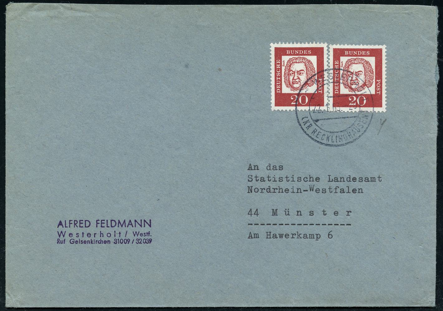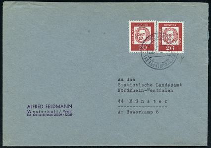 7513 | 12 € | PL-Raum 43.. (ohne Essen u. Mülheim/Ruhr) : WESTERHOLT/ (KR RECKLINGHAUSEN) 1963 (22.1.) aptierter 2K-Steg = alte PLGZ entfernt auf 2x 20 Pf. Bach, Fern-Bf. | ![]() | |