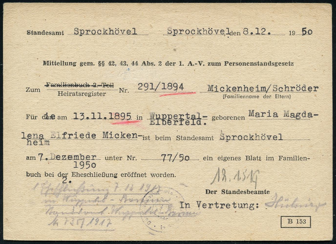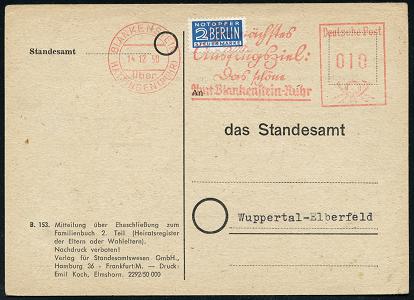 7449 | 15 € | PL-Raum 43.. (ohne Essen u. Mülheim/Ruhr) : BLANKENSTEIN/ über/ HATTINGEN (RUHR)/ Ihr nächstes/ Ausflugsziel/ d.schöne/ Amt Blankenstein-Ruhr 1950 (14.12.) AFS Francotyp "Posthorn" 010 Pf. PSt. I-Typ, Text teils Sütterlin auf 2 Pf. NoB = Vorausentwertung , Dienst-Kt. Standesamt n. Wuppertal (Dü.E-20CG) | ![]() ![]() | |