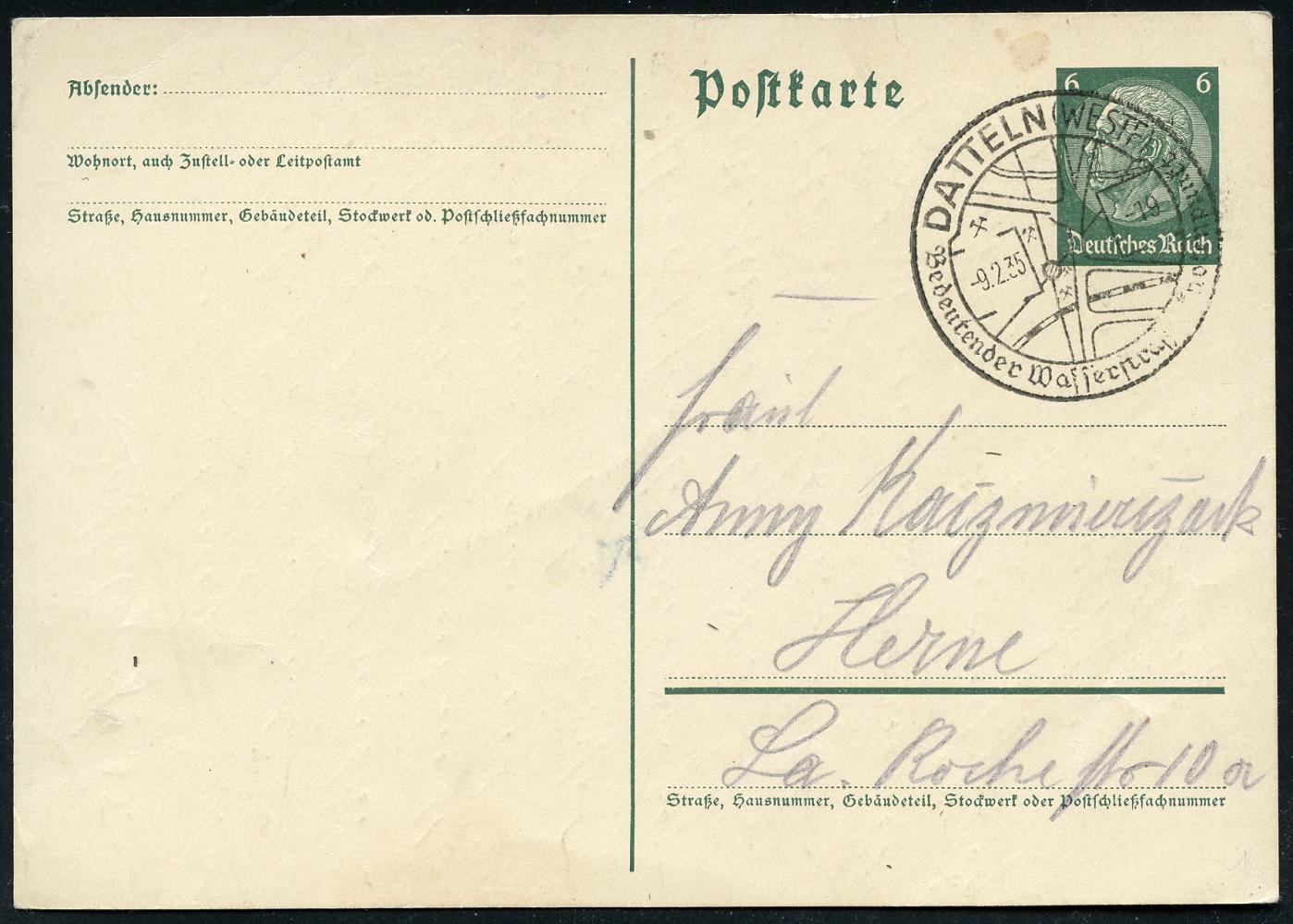 7450 | 16 € | PL-Raum 43.. (ohne Essen u. Mülheim/Ruhr) : DATTELN (WESTF)/ Bedeutender Wasserstraßenknotenpunkt 1935 (9.2.) HWSt (Wasserstraßennetz) auf Bedarfs-Kt. (Bo.1, nur 1934 bis Anfang 1936 verwendet) | ![]() | |
