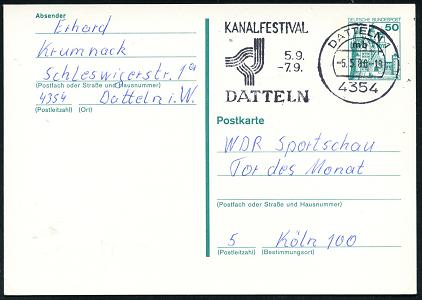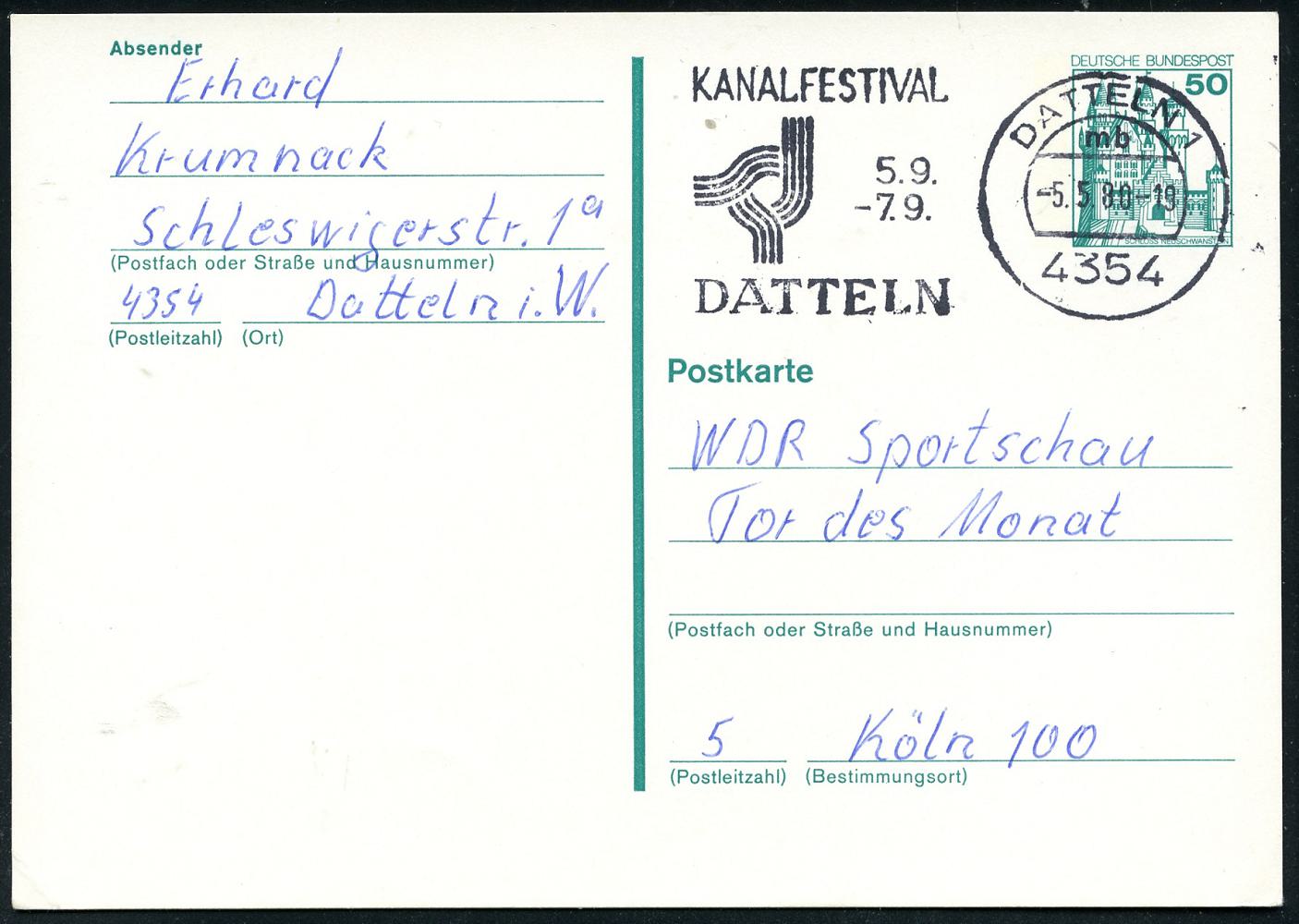 7456 | 6 € | PL-Raum 43.. (ohne Essen u. Mülheim/Ruhr) : 4354 DATTELN 1/ mb/ KANALFESTIVAL/ 5.9./ -7.9. 1980 (5.5.) MWSt (Wasserstraßen-Dreieck) Bedarfs-Kt. | ![]() | |