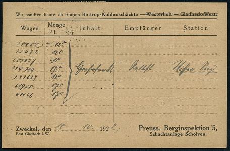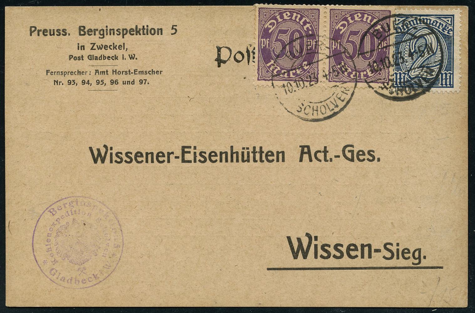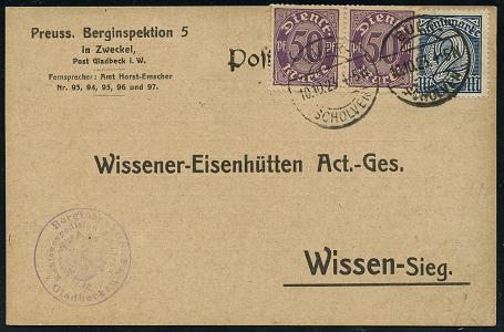 7459 | 18 € | PL-Raum 43.. (ohne Essen u. Mülheim/Ruhr) : BUER-/ SCHOLVEN 1922 (9.9.) 1K-Brücke auf Dienst 50 Pf.+ 1 Mk. auf Dienstkt: Preuss. Berginspektion 5 in Zweckel + viol., aptierter Dienst-HdN: Berginspektion 5.. Gladbeck, "Kaiserl." entfernt, aber alter kaiserl. Adler n. Wissen (Mi.D 29 (2), D 30) | ![]() ![]() | |