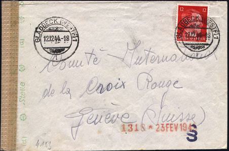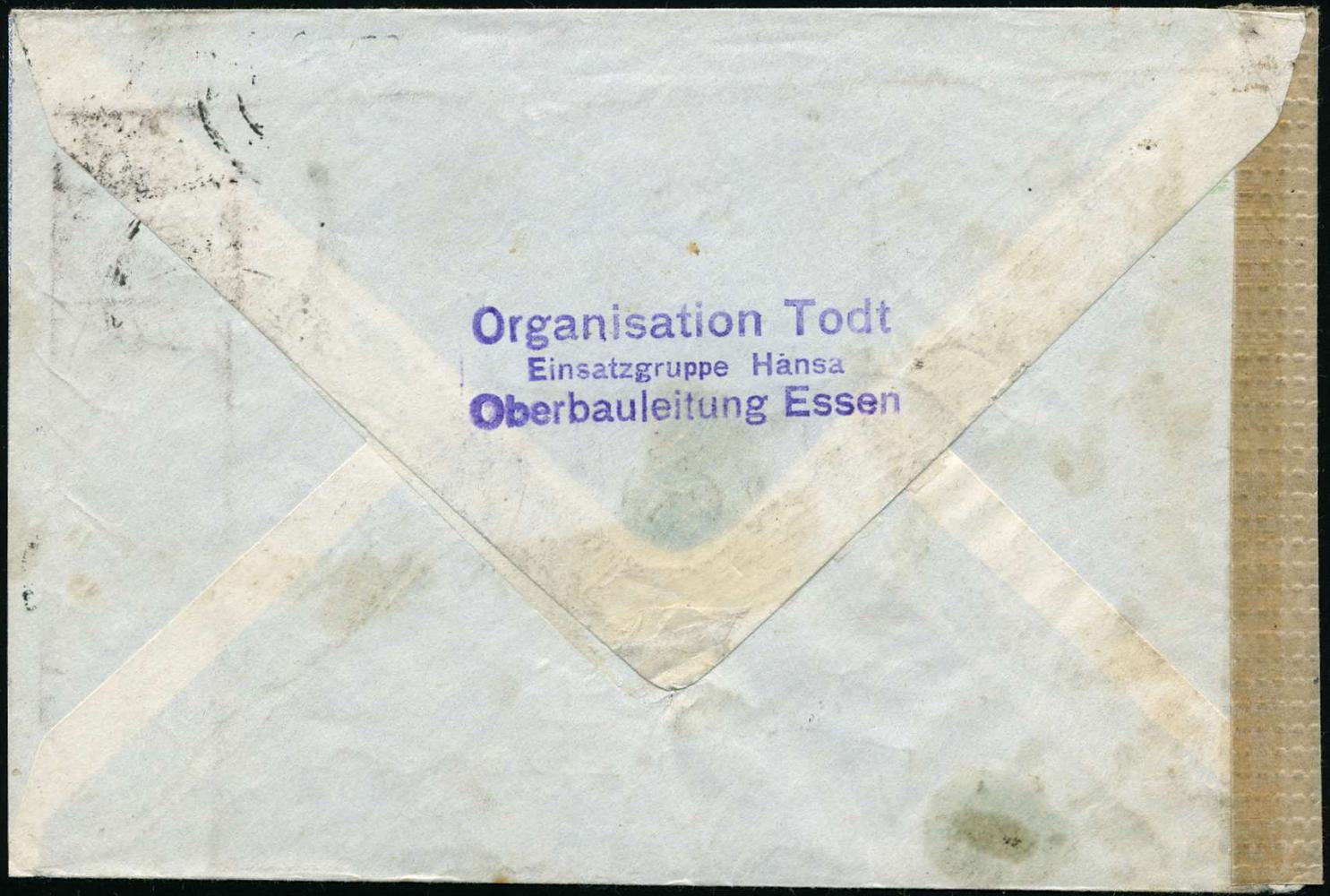 7464 | 40 € | PL-Raum 43.. (ohne Essen u. Mülheim/Ruhr) : GLADBECK (WESTF)1/ l 1944 (12.12.) 2K-Steg auf EF 12 Pf. Hitler + rs. viol. Abs.-3L: Organsation T o d t /Einsatzgruppe Hansa/ Oberbauleitung Essen + seltener, grüner Gestapozensur-Band-Stempel: Zensur/ Stelle/(d) (= München, Rie.D-23, 100 Pkte.) unbeanstandet an I.R.K. Genf, irrtümlich mit Inl.-Tarif frankiert (Mi.827 EF) | ![]() ![]() | |