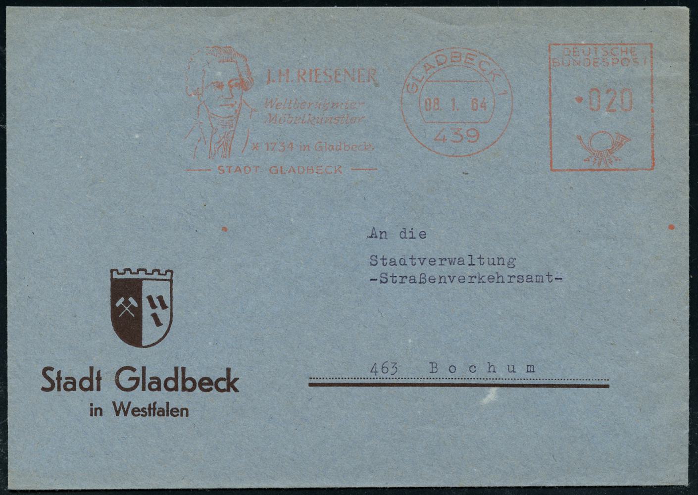 7468 | 16 € | PL-Raum 43.. (ohne Essen u. Mülheim/Ruhr) : 439 GLADBECK 1/ J.H.RIESNER/ Weltberühmter/ Möbelkünstler/ *1734.. 1963 (8.1.) AFS Francotyp (Brustbild) Kommunal-Bf.: Stadt Gladbeck.. (Dü.E-26) | ![]() | |